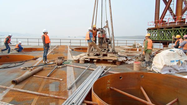 由于江心平台搭建的原因,经过一个多星期的筹备等待后工程才开工。工程伊始各种繁杂的工作一齐向我涌来,原本以为好打的岩层,却和预料之中相去甚远,单孔耗时竟然是预计时间的两倍!44#主墩平台工程预期完成时间一下子拉长半月有余,一下子打乱了甲方的施工部署,二航局每天无时无刻都在催促我们加紧进度。由于平台狭小甲方的气体反循环钻机紧邻我们施工,对我们的正常钻进产生了很大的影响,再加上江心基岩上的第四系砂土覆盖层渗透系数大,造成钻孔严重漏浆。加深套管,无效!投掷泥球,无效!钻进毫无进展,膨润土用量却惊人,钻探成本超支严重,工程的完成之日一下子变得遥遥无期起来。朱怀高院长知道情况后赶到施工一线,决定增加钻机班组并使用双层套管,并马上付诸行动,连夜购置来110mm套管,任你大钻机扰动,我自巍然不动,漏浆问题一下子得到了解决,我心里长长地舒了一口气,终于看到希望了。